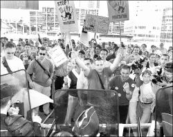 PROTESTAS EN FRANCIA CONTRA PRIVATIZACIONES  En París, trabajadores de la electricidad se enfrentaron ayer con la policía ante la torre de Electricite de France, donde protestaron por la privatización parcial de la firma estatal. Un día antes los sindicatos efectuaron un corte de energía eléctrica en la estación de trenes más importante de París FOTO AFP