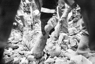 Rescate de una de las víctimas del ataque suicida con coche bomba en la capital iraquí. La detonación ocurrió en la plaza Tahrir cuando pasaba un convoy de vehículos que transportaba a trabajadores de la industria eléctrica y guardias de seguridad. Dos británicos, un estadunidense y un francés se contaban entre los fallecidos, y otros 10 contratistas estaban entre los más de 60 heridos FOTO REUTERS