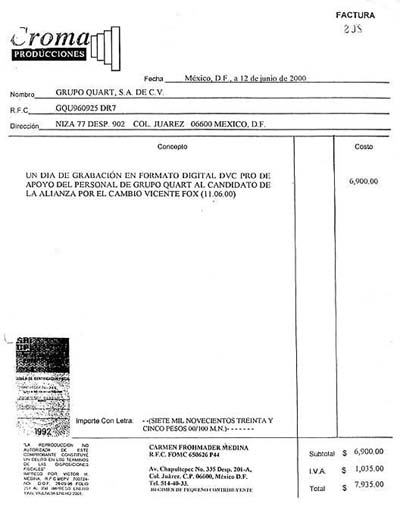 La Procuraduría General de Justicia del Distrito Federal encontró diversos documentos contables del Grupo Quart, propiedad de Carlos Ahumada Kurtz, en el cateo que realizó el 22 de junio en las instalaciones de la planta de asfalto ubicada en Lomas de Tarango, delegación Alvaro Obregón. Entre ellos destaca la factura aquí mostrada, emitida por la empresa de video Croma Producciones por el concepto de "apoyo del personal de grupo Quart al candidato de la Alianza por el Cambio Vicente Fox".