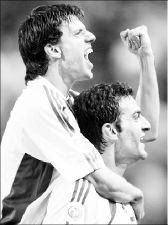 CAYO EL GIGANTE  En la mayor sorpresa de la Eurocopa, Grecia dio cuenta de Francia al derrotarla por 1-0, para clasificarse a semifinales. En la foto, Takis Fyssas y Trainos Dellas celebran el triunfo FOTO REUTERS