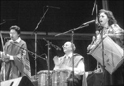 El grupo mexicano Los Folkloristas inauguró este sábado, en las escaleras de la catedral de Girona, el quinto Festival de Músicas Religiosas del Mundo. En la imagen, José Avila, Adrián Nieto y Olga Alanís durante su concierto FOTO EFE
