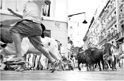 45 HERIDOS AL ABRIR LA PAMPLONADA  Los astados son llevados por la multitud en las calles de la capital navarra rumbo a la plaza, en el primero de los siete encierros de toros por la fiesta de San Fermín, que se celebra cada año FOTO REUTERS