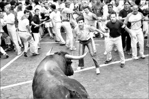 Participantes en el tercer encierro, en San Fermín, Pamplona, esperan la embestida del toro FOTO AFP