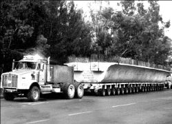 Tractocamión con una trabe a cuestas, en camino