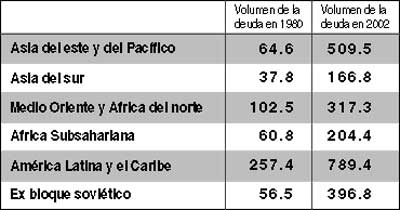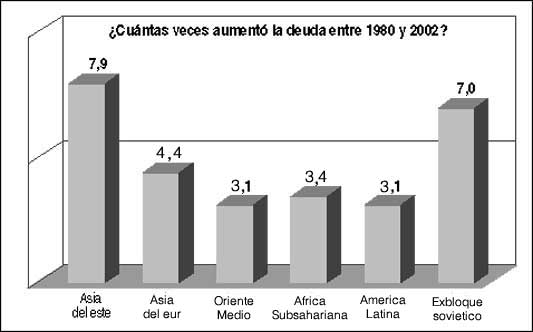En conjunto, los países en desarrollo vieron cómo su deuda externa pública aumentó de 579 mil 600 millones de dólares en 1980 hasta dos billones 384 mil 200 millones de dólares en 2002, conforme a las cifras del Banco Mundial. Pero en ese mismo periodo esas naciones realizaron pagos a sus acreedores por cuatro billones 600 mil millones de dólares, es decir, rembolsaron ocho veces lo que debían, para terminar cuatro veces más endeudados.
