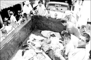 VIOLENCIA EN COLOMBIA  El Alto Comisionado de las Naciones Unidas para los Refugiados pidió ayer al gobierno colombiano atender la crítica situación derivada del éxodo en los departamentos de Antioquia y Casanare, tras los combates entre las Fuerzas Armadas Revolucionarias de Colombia (FARC) y el ejército, que el fin de semana dejaron nueve muertos y obligaron al desplazamiento de 600 personas. La imagen, durante el traslado de los cuerpos de siete personas asesinadas por presuntos integrantes de las FARC, en Antioquia FOTO REUTERS