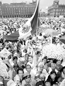 Decenas de miles de personas se concentraron en el Zócalo al concluir la marcha de las 100 horas en apoyo del jefe de Gobierno del Distrito Federal, Andrés Manuel López Obrador, convocada por el Partido de la Revolución Democrática. La dirigencia capitalina de ese partido aseguró que el movimiento de defensa del gobernante va creciendo en todo el país FOTO MARCO PELAEZ