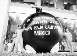 PROTESTA CONTRA GASERAS  Activistas de Greenpeace al instalar, en mayo pasado, frente a la Secretaría de Energía una réplica de los contenedores de gas natural licuado que se instalarán en la frontera norte del país FOTO MARIA MELENDREZ PARADA