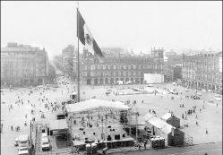 La ciudad ayer y hoy  Plaza de la Constitución, ca. 1918 FOTO HUGO BREHMEDesde la Catedral Metropolitana se aprecia el Antiguo Palacio del Ayuntamiento, sede del gobierno de la ciudad desde el Virreinato. El edificio luce ya su tercer nivel, construido por el arquitecto Manuel Gorozpe en 1907. Hacia la izquierda se observa el callejón de la Diputación. Atrás, se asoman las cúpulas del Palacio de Hierro y de las Fábricas Universales, importantes centros comerciales fundados durante el porfiriato. Al fondo, a la derecha, se encuentran el Centro Mercantil, inaugurado en 1898 por Porfirio Díaz, y la estación de los tranvías que llegaban a esta plaza. Las áreas jardinadas habían sustituido ya la tradicional arbolada  Plaza de la Constitución, 2000 FOTO PEDRO HIRIARTSe aprecia el Antiguo Palacio del Ayuntamiento con nuevos relieves y un piso más, agregado entre 1934 y 1936. En beneficio del automóvil la estación de tranvías se suprimió en 1920 y se abrió la avenida 20 de Noviembre. Así se ganó una magnífica vista de la Catedral Metropolitana, pero desaparecieron importantes edificios históricos. A la derecha, el portal de mercaderes, cuyo renovado aspecto colonial se integra al entorno; la remodelación del edificio conservó los arcos pero les dio mayor altura para alojar comercios, oficinas públicas y hoteles. En primer plano un escenario de las fiestas populares, organizadas en 2000 por el primer gobierno electo del Distrito Federal.