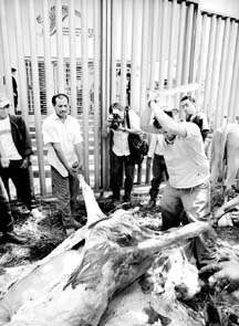 Campesinos de Oaxaca, Chiapas y Veracruz destazaron la res en protesta por la negativa de la dependencia a entregarles 3.1 millones de pesos para un programa de apoyo ganadero que beneficia a 35 grupos de ejidatarios FOTO JOSE NUÑEZ