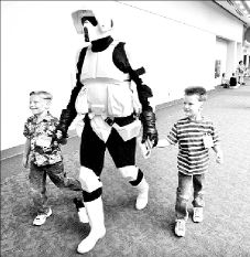LA VENGANZA DEL SITH  Un hombre disfrazado de Storm Tropper asiste con sus hijos a la 35 edición de la Convención Internacional de Comic, en San Diego, California, donde LucasFilm dio a conocer ayer el nombre del último capítulo de la zaga La guerra de las galaxias: Episodio 3: La venganza del Sith. Durante la presentación, hecha por Steve Sansweet, director de relaciones de la productora, estuvieron presentes los actores Carrie Fischer y Hayden Christensen. (Con información de Martín Arceo) FOTO AFP
