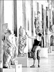EL MERCADO DE ATTALOS  Una turista observa las estatuas colocadas en el antiguo Stoa de Attalos, un mercado del siglo II aC, localizado a los pies de la colina de la Acrópolis. El Stoa fue dedicado en el año 150 antes de nuestra era al rey Attalos de Pérgamo FOTO AFP