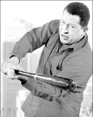 Caracas, 5 de agosto. Hugo Chávez, presidente de Venezuela, toma el bate de beisbol que le regaló Sammy Sosa, pelotero dominicano de los Cachorros de Chicago, y levantándose de la silla abanica para conectar una pe-lota imaginaria que vuela hasta el jardín de la Casa Blanca, en Washington.