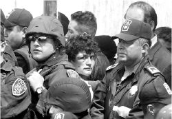 Con el rostro amoratado y apenas visible entre una docena de elementos de Fuerza de Tarea de la Secretaría de Seguridad Pública que la salvaguardaban de la muchedumbre, Moncayo Gallegos articula las palabras con dificultad.