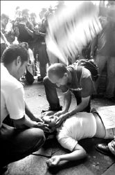Momentos de la protesta de vendedores ambulantes, ayer en el Zócalo. En la primera imagen, una joven es atendida luego de sufrir un desmayo FOTOS YAZMIN ORTEGA CORTES