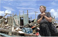 DEJA CUATRO MUERTOS LA ESTELA DE CHARLEY EN CUBA  Una mujer relata cómo sobrevivió al paso del huracán, que destrozó su vivienda (al fondo) en la provincia de Batabano, 20 kilómetros distante de La Habana. El meteoro, con rachas de viento de 170 kilómetros por hora, dañó en 60 minutos 576 casas y 45 negocios, además de dejar cuatro heridos. Estados Unidos, también afectado por el fenómeno en la zona de Florida, ofreció a Cuba 50 mil dólares para mitigar los efectos del desastre FOTO AFP