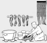 LAS MADEJAS se sacan, se tuercen para exprimirlas y se secan al sol. Una tercera tinta negra se ha elaborado en una olla de barro enterrada; sólo sobresale el cuello para que mantenga una temperatura constante y no reciba luz, cuando menos por un mes. La tinta se prepara con agua, vinagre, cáscara de plátano manzano y pedacería de fierro.