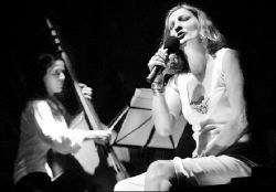 Vestida de blanco, con un saco negro, se sale del cliché de la tanguera de indumentaria sensual. No lleva el tango en la ropa, lo lleva dibujado en el rostro: ojos dramáticos pintados con sombra oscura y labios rojo sangre, el mismo color del escenario donde piano, bandoneón, contrabajo y guitarra se hacen uno.