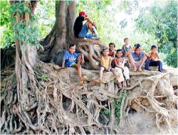 cobijados a la sombra de una construcción, a un costado del pozo,