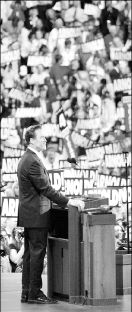 Antes del programa principal, el podio se utilizó para ofrecer al-guna imagen de diversidad frente a un mar casi homogéneo de caras blancas. Rod Paige, secretario de Educación, africanoamericano él, dio algunos puntos sobre la "compasión" de Bush en sus programas para los niños y la educación.