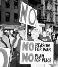 El presidente, "el terrorista más grande del mundo", corean 5 mil pacifistas en el centro de NY