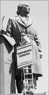 Activistas de Greenpeace se manifestaron en el monumento de Miguel Hidalgo en Tijuana, donde colocaron una pancarta que reza: ''Independencia energética'', durante una protesta por la instalación de plantas de gas natural licuado en Baja California, que representan un riesgo para la seguridad de la población FOTO LUZ SERRANO