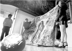 patrio rasgado con cascabeles colgantes, una imagen de la Virgen de Guadalupe