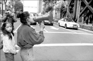Angeles Ileana Murillo, esposa del policía preventivo Edgar Arturo Rojas Escobar, protestó ayer frente a la Secretaría de Seguridad Pública (SSP) capitalina, en compañía de su hija, para exigir la restitución de su cónyuge en la corporación. Con la misma demanda, Rojas Escobar mantuvo un plantón durante varios meses, enfrente de la puerta principal de la dependencia, y la semana pasada fue desalojado. Su destitución ocurrió luego de que fue herido de cinco impactos de bala, en servicio, y días después se le dio de baja "por no ser apto". Ayer, Ileana Murillo se entrevistó con el titular de la dependencia, Marcelo Ebrard Casaubón, quien le prometió reintegrar a su esposo a la SSP y analizar la posibilidad de pagarle salarios caídos, que datan de 1998 FOTO ALFREDO DOMINGUEZ