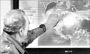 IVAN AZOTA JAMAICA; SE DIRIGE A CUBA Y LAS CAIMAN  El presidente cubano, Fidel Castro, señala en una imagen televisada la isla de la Juventud, amenazada por el avance del huracán que mató al menos a 14 jamaicanos antes de salir de nuevo al mar y retomar la categoría cinco, con la que se enfiló hacia Cuba, donde 500 mil personas dejaron sus casas en busca de refugio. En Quintana Roo, México, 2 mil 250 habitantes fueron desalojados ante la proximidad del meteoro FOTO REUTERS