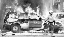 junto a una fila de patrullas que bloqueaban un puente en el centro de