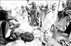 Escolares sudaneses compran comida en las calles del campo de desplazados de Krinding, en la región de Darfur FOTO AFP