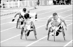 del primer lugar que logró en 100 metros sobre silla de ruedas.