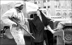 FOTOGRAFO KARIM SAHIB GANA EL PREMIO BAYEUX  Fotografía tomada el 31 de julio de 2003 que muestra a una iraquí cuando le ruega a un soldado estadunidense, en la calle Haifa de Bagdad, que no detenga a su pequeño hijo FOTO AFP