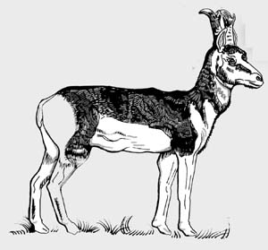 ESTA ES LA UNICA ESPECIE de antílope que existe en el país. Le son característicos sus cuernos de dos puntas sobre una base ancha y las manchas blancas de su piel destacan sobre el café claro o canela de su cuerpo. En la madurez mide cerca de un metro cuarenta centímetros (cabeza y cuerpo); los machos pesan unos 60 kilos y las hembras 45. Los dos sexos tienen cuernos; los de las hembras son pequeños y apenas sobresalen de las orejas que están un poco curvadas hacia dentro.
