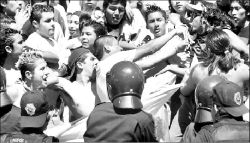 navajas, botellas, palos, cinturones con hebillas gruesas, cohetones y