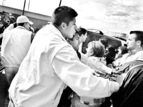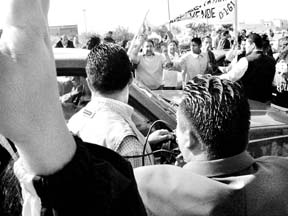 Elementos del Estado Mayor Presidencial tratan de contener a los manifestantes que ayer, en Ciudad Juárez, bloquearon el paso de la comitiva de Vicente Fox y golpearon vehículos que acompañaban al mandatario y el gobernador de Chihuahua, José Reyes Baeza Terrazas. Representantes de PAN, PRI y PRD condenaron la violencia y pideron respeto para la investidura del titular del Ejecutivo FOTOS NORTE DE CIUDAD JUAREZ /ERNESTO RODRIGUEZ
