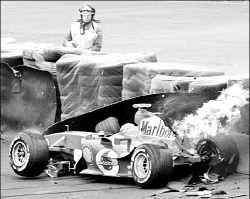 El Ferrari de Michael Schumacher se incendió luego de estrellarse contra la barrera en el circuito de Interlagos en Sao Paulo, Brasil FOTO AFP