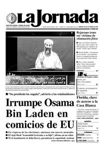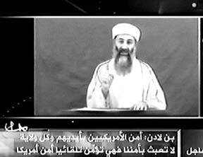 En nuevo video difundido por la emisora Al Jazeera, Osama Bin Laden afirma que la única garantía contra nuevos ataques de Al Qaeda es un mandato presidencial estadunidense "que no ponga en peligro nuestra seguridad" y sostiene que la lucha contra el terrorismo es sólo un pretexto de la Casa Blanca para expoliar a las naciones árabes FOTO AFP