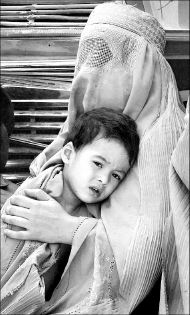 Un sucio chal blanco con flores rotas le cubre la cabeza y los hombros, es demasiado pequeña para llevar la burka, que no se suele llevar hasta la pubertad.