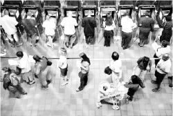 Elecciones en Estados Unidos  Simpatizantes de Bush festejan en Washington las tendencias favorables al mandatario republicano FOTO REUTERS  Largas filas de votantes en el condado Miami-Dade, Florida, estado que finalmente se inclinó por la relección del presidente FOTO REUTERS  Michael Moore, ayer en Tallahassee, Florida FOTOREUTERS  Partidarios de Kerry, en Las Vegas FOTO AFP  Seguidores del senador demócrata esperan en Boston resultados de los comicios FOTO REUTERS