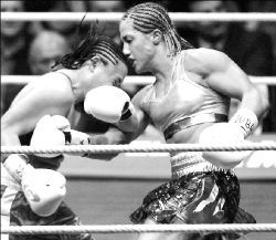 Miryam Lamare (derecha) se convirtió en la primera gala en conquistar el campeonato welter ligero al derrotar a la estadunidense Eliza Olsan durante la celebración de los 100 años de la Federación de Boxeo de Francia FOTO AFP
