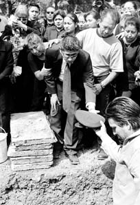 El hijo de Víctor Mireles, el oficial federal que fue quemado vivo junto con su compañero Cristóbal Bonilla en San Juan Ixtayopan, Tláhuac, entrega el quepis de su padre durante el sepelio en el Panteón Jardín. La Procuraduría General de la República informó que tiene pruebas suficientes para consignar a 22 personas detenidas por el linchamiento del pasado martes FOTO JESUS VILLASECA