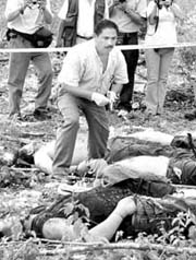 Cinco cadáveres, tres de policías de la Agencia Federal de Investigación, fueron hallados en un paraje de la carretera Cancún-Mérida. A pocos kilómetros se encontraron cuatro cuerpos calcinados en la cajuela de un vehículo FOTO JOSE DOMINGUEZ/ NOTIMEX