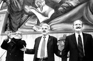 Los escritores Gabriel García Márquez, premio Nobel, y Carlos Fuentes flanquean al presidente de Cataluña, Pasqual Maragall, en la inauguración de la cátedra Julio Cortázar, en el contexto de la Feria Internacional del Libro, en Guadalajara FOTO ARTURO CAMPOS CEDILLO