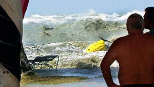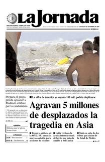 Esta fotografía tomada por un turista muestra un tsunami azotando la playa de Batu Ferringhi en la isla Penang, de Malasia. El maremoto, que mató a unos 65 habitantes en ese país, siguió su paso destructor por la línea costera de Tailandia, donde cobró la vida de más de 2 mil personas. En tanto, en Sri Lanka las olas gigantes se adentraron hasta 3 kilómetros en el Parque Nacional de Yala, la mayor reserva natural del país y hogar de cientos de elefantes y varios leopardos, cuyos cuerpos no han aparecido. "Creo que los animales presintieron el desastre", declaró uno de los responsables del lugar, que era visitado en el momento del siniestro por unos 40 turistas, quienes murieron ahogados después del sismo de 9 grados Richter y el intenso oleaje que le siguió FOTO ERIC SKITZI /AFP