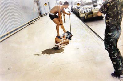 Esta imagen fue utilizada como prueba contra tres soldados del Regimiento Real de Fusileros en el consejo de guerra que se les sigue en Osnabrack, Alemania. En ella se observa al cabo Darren Larkin parado sobre un detenido iraquí atado con una red, mientras un compañero fotografía la escena. Los tres están acusados de torturas y humillaciones sexuales contra civiles en el campo de almacenaje conocido como Cesta de pan, cerca de Basora. En la corte alegaron inocencia con el argumento de que les ordenaron "ser duros con los prisioneros'' FOTO AFP