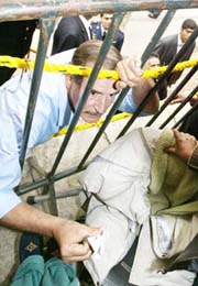 El presidente Vicente Fox declaró en Naucalpan que su gobierno acabó con políticas populistas y paternalismo para enfocarse en la fórmula de la corresponsabilidad. En la foto, una anciana le solicita una silla de ruedas a través de las rejas que colocó el Estado Mayor FOTO FRANCISCO OLVERA