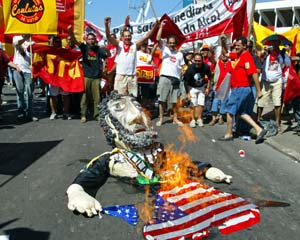 Las protestas contra el presidente brasileño se dieron tanto en las calles de Porto Alegre -se quemó un muñeco con su efigie y la bandera de Estados Unidos- como en el recinto donde pronunciaba un discurso en el marco del encuentro social. Sus medidas económicas han sido severamente cuestionadas FOTO AFP