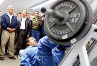 Andr�Manuel L� Obrador visito ayer el gimnasio Amalia P�z y Sa�l Mendoza, durante una gira de trabajo por Iztacalco. Lo acompa�n el delegado Armando Quintero y la titular del Deporte del GDF, Dione Anguiano .FOTO Yazmin Ortega Cortes