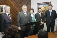 Alejandro Encinas, Raquel Sosa, Mart�atres y Marcelo Ebrard, durante el anuncio de los nombramientos y renuncias en el gobierno capitalino FOTO Arturo Garc�Campos